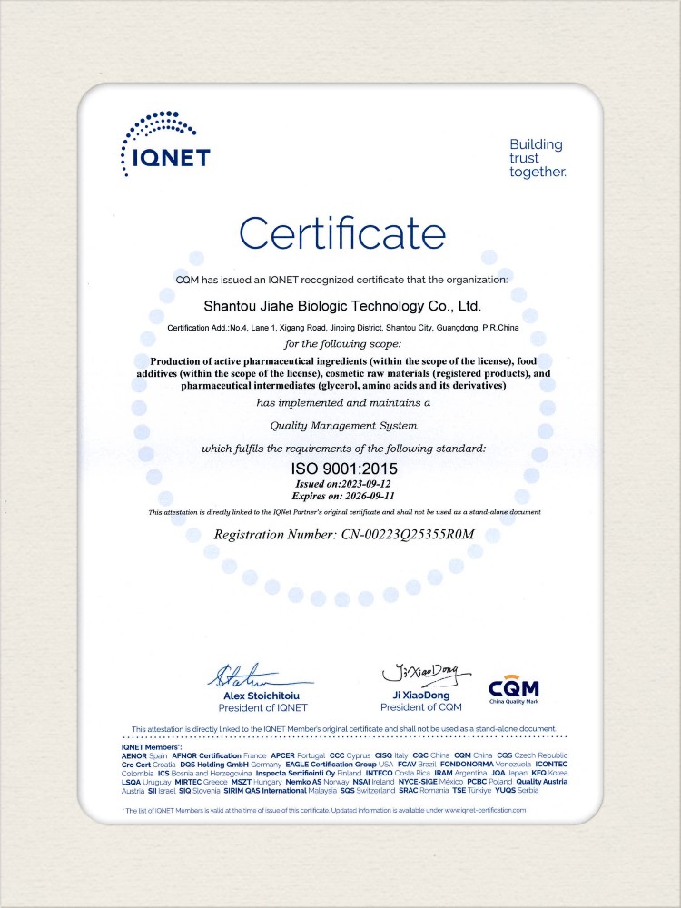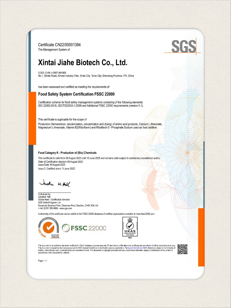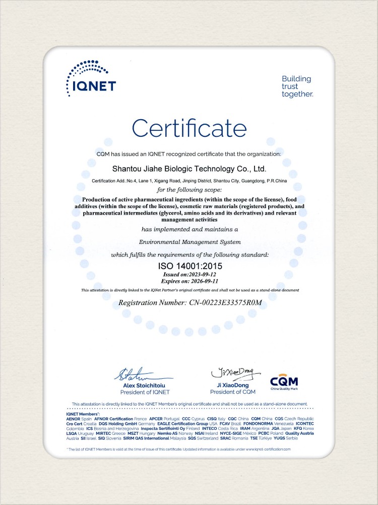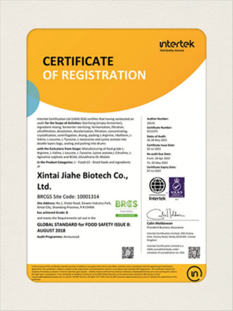 汕頭佳禾生物科技有限公司是一家致力于氨基酸及其衍生物研發(fā)、生產(chǎn)和銷售的國家高新技術(shù)企業(yè),先后通過了國家藥品GMP認(rèn)證,ISO9001質(zhì)量體系認(rèn)證、ISO14001環(huán)境管理體系認(rèn)證。目前,公司擁有“廣東省專精特新中小企業(yè)”、“廣東省氨基酸產(chǎn)品工程技術(shù)研究中心”、“汕頭市生物發(fā)酵工程技術(shù)研究開發(fā)中心”、“汕頭市知識產(chǎn)權(quán)優(yōu)勢企業(yè)”、“多項國家發(fā)明專利”、“廣東省守合同重信用企業(yè)”等多項資質(zhì)和榮譽,旗下“佳禾牌”系列產(chǎn)品已成為原料藥行業(yè)知名品牌。 新泰市佳禾生物科技有限公司成立于2012年8月,注冊資金2億元,公司位于山東泰安新泰市新汶工業(yè)園區(qū),是國 家級高新技術(shù)企業(yè)、山東省“專精特新”企業(yè)、山東省制造業(yè)單項冠軍企業(yè)、泰安市科技型中小企業(yè)、泰安市農(nóng)業(yè)產(chǎn)業(yè)化龍頭企業(yè)、中國生物發(fā)酵產(chǎn)業(yè)協(xié)會理事單位。